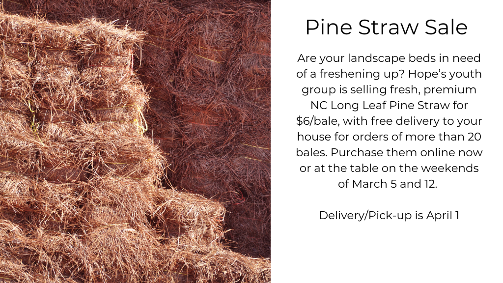 Are your landscape beds in need of a freshening up? Hope’s youth group are selling fresh, premium NC Long Leaf Pine Straw for $6/bale, with free delivery to your house for orders of more than 20 bales. Purchase them online now or at the table on the weekends of the 5 and 12. Delivery/pick up will be on April 1 from 8-11AM.