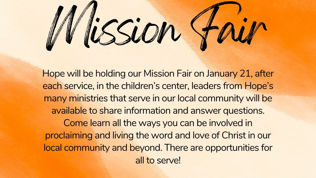 MISSION FAIR. Hope will be holding our Mission Fair on January 21, after each service, in the children’s center, leaders from Hope’s many ministries that serve in our local community will be available to share information and answer questions. Come learn all the ways you can be involved in proclaiming and living the word and love of Christ in our local community and beyond. There are opportunities for all to serve!