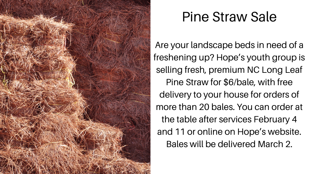 Are your landscape beds in need of a freshening up? Hope youth attending the summer mission trip are selling bales of fresh, premium pine straw for $6/bale, with free delivery for orders of more than 20 bales. You can order at the table after services February 4 and 11 or online on Hope’s website. Bales will be delivered or available for pick-up Saturday, March 2. Questions? wspottiswood@hopelutheranwf.org.