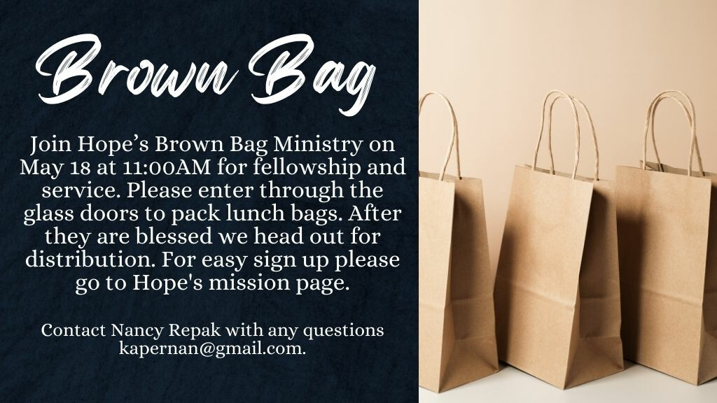 JOIN HOPE'S BROWN BAG MINISTRY. May 18 at 11:00AM for fellowship and service. Please enter through the glass doors to pack lunch bags. After they are blessed we head out for distribution. For easy sign up please go to Hope's mission page.