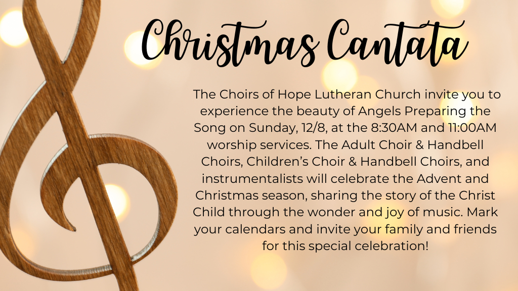 The Choirs of Hope Lutheran Church invite you to experience the beauty of Angels Preparing the Song on Sunday, 12/8, at the 8:30AM and 11:00AM worship services. The Adult Choir & Handbell Choirs, Children’s Choir & Handbell Choirs, and instrumentalists will celebrate the Advent and Christmas season, sharing the story of the Christ Child through the wonder and joy of music. Mark your calendars and invite your family and friends for this special celebration!