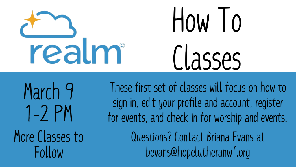 Over the month of March, we will be offering Realm How-To Classes to help you navigate our new church management system. These first set of classes will focus on how to sign in, edit your profile and account, register for events, and check in for worship and events. These classes will be held on different days and times to accommodate everyone's schedule. The first session will be on 3/9/2025 at 1:00PM in Room 301. These sessions are designed to make it easy for you.
