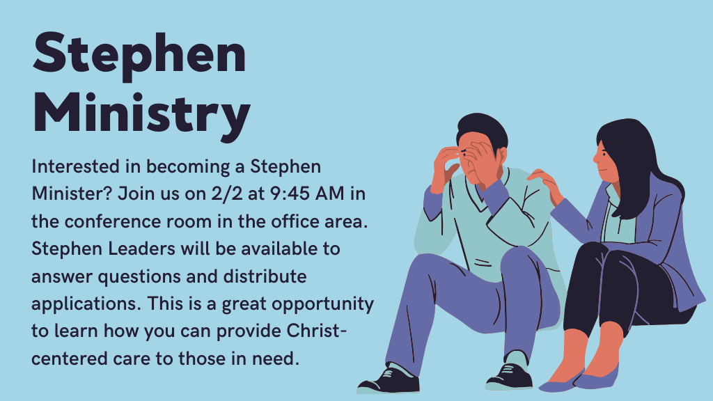 Interested in becoming a Stephen Minister? Join us on 2/2 at 9:45 AM in the conference room in the office area. Stephen Leaders will be available to answer questions and distribute applications. This is a great opportunity to learn how you can provide Christ-centered care to those in need.